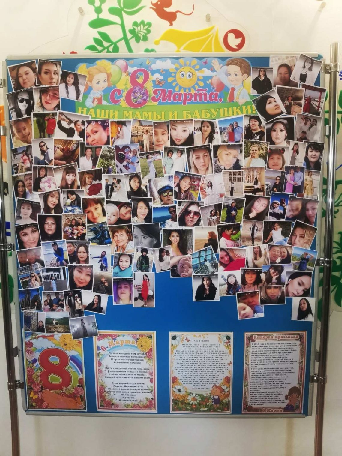 В период с 27 февраля по 7 марта в детском саду были проведены мероприятия к празднику Восьмое Марта: утренники и тематические музыкальные занятия во всех группах детского сада, оформлена выставка портретов мам и бабушек. Сюрпризом для мам и бабушек оказался стенд с их фотографиями из чатов вайбера «С 8 Марта мамы и бабушки!».