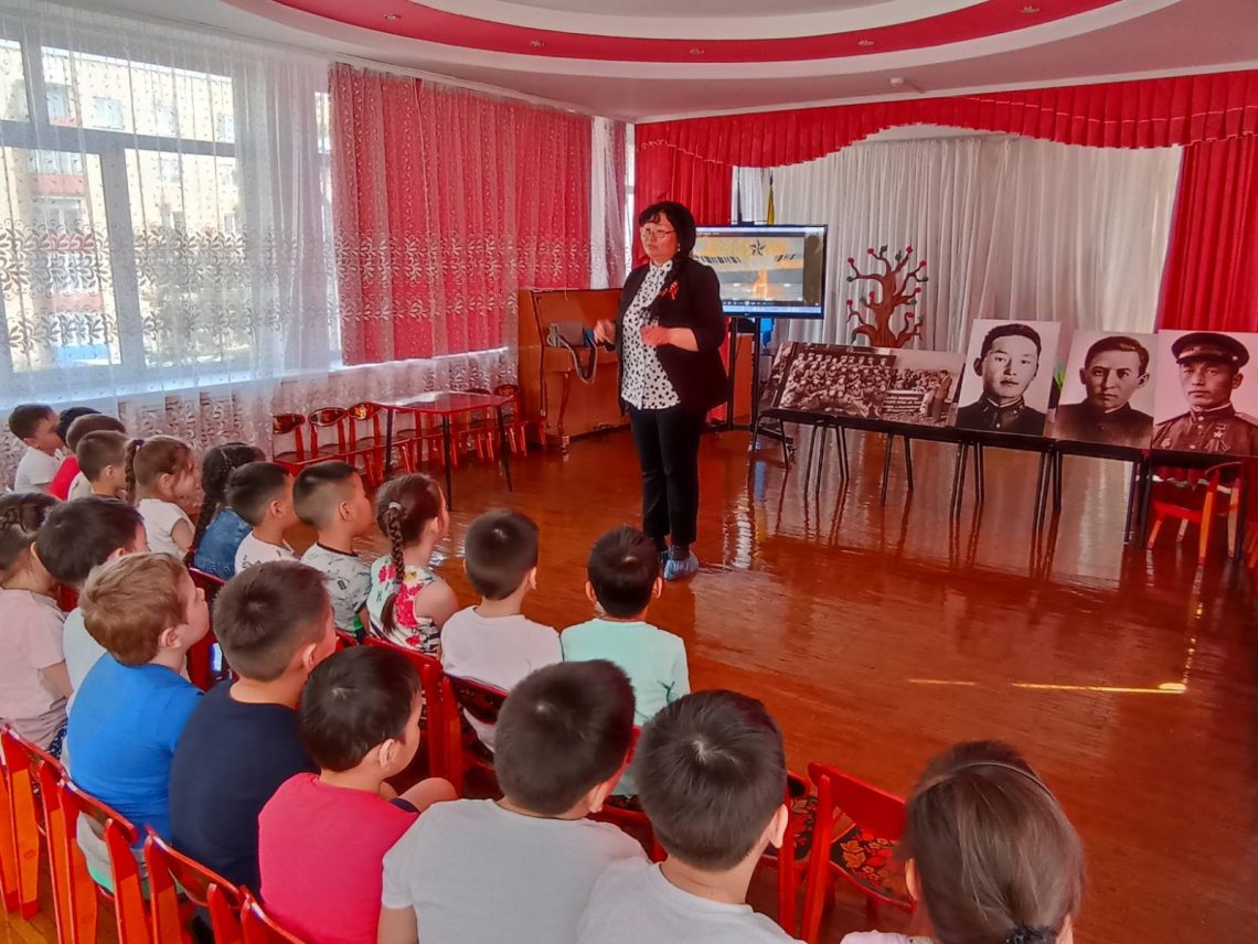 2 мая к празднованию Дня Победы мы встречали в стенах своего детского сада сотрудника Национального музея им. Алдан Маадыр, методиста отдела истории и этнографии, Майю Оюновну Дыртык-оол. Дети просмотрели и обсудили фильм «Роль Тувы в Великой Отечественной Войне», играли в подвижную игру , поучаствовали в викторине «Военные профессии», прослушали рассказ и просмотрели фотовыставку В.П. Ермолаева «Тувинские добровольцы», прослушали рассказ о подвиге М.А. Бухтуева. Дети с интересом слушали и вступали в рассуждения и с удовольствием играли.