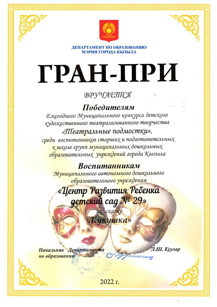 Старания наших членов команды постановщиков и старания детей были отмечены членами жюри высокой наградой — ГРАН-ПРИ среди коллективов автономных дошкольных учреждений города Кызыла!